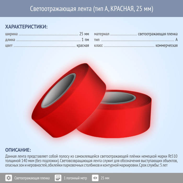 Светоотражающая однородная лента (тип А, КРАСНАЯ, 25 мм х 1 п.м.) в Москве купить