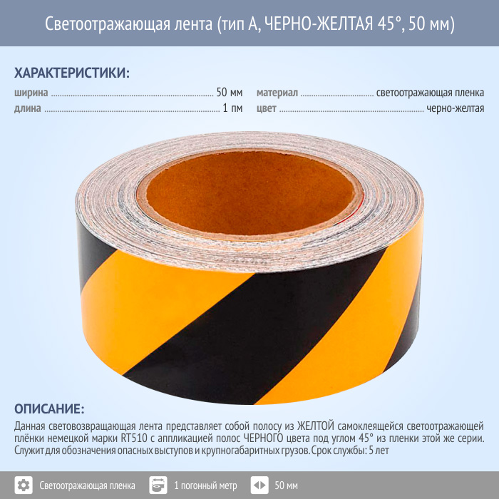 Светоотражающая сигнальная лента (тип А, ЧЕРНО-ЖЕЛТАЯ 45°, 50 мм х 1 п.м.) в Москве купить