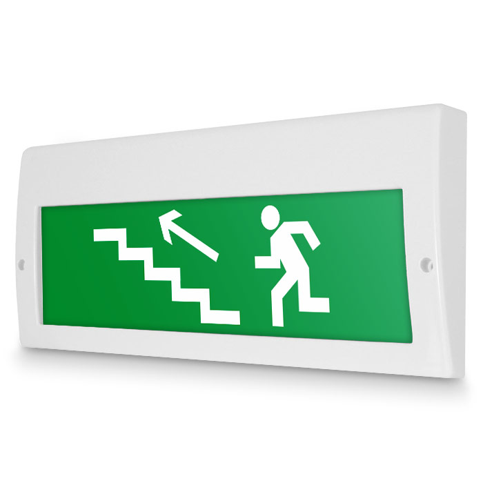 Световое табло «Направление к эвакуационному выходу по лестнице вверх (левосторонний)», Молния (220В РИП) в Москве купить