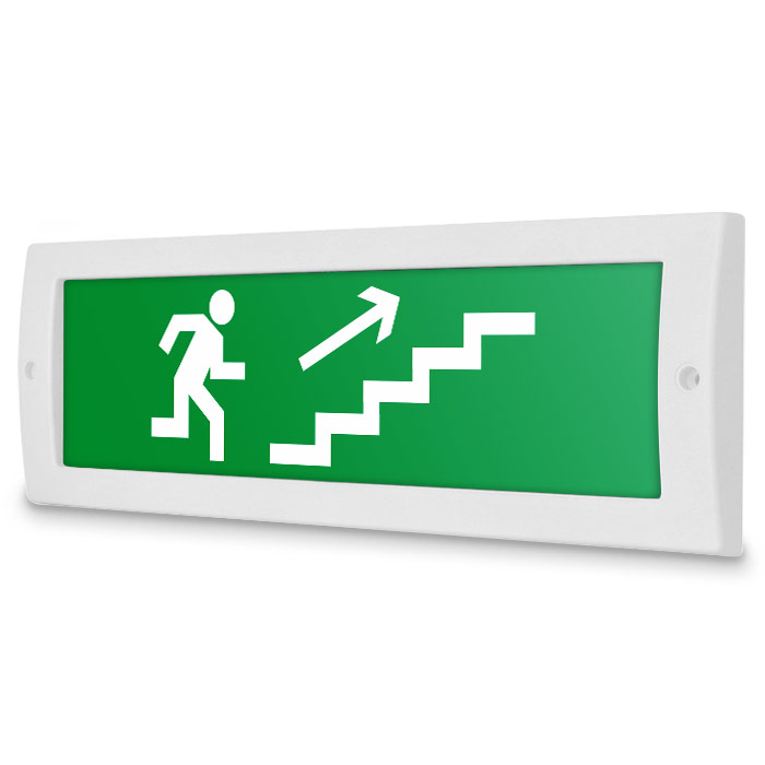 Световое табло «Направление к эвакуационному выходу по лестнице вверх (правосторонний)», Молния (12В) в Москве купить