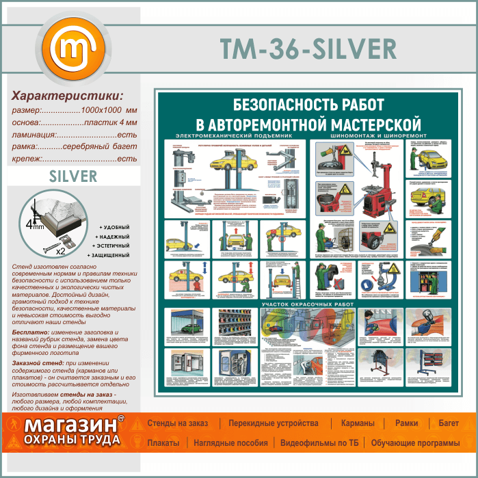 Стенд «Безопасность работ в авторемонтной мастерской» (TM-36-SILVER) в Москве купить