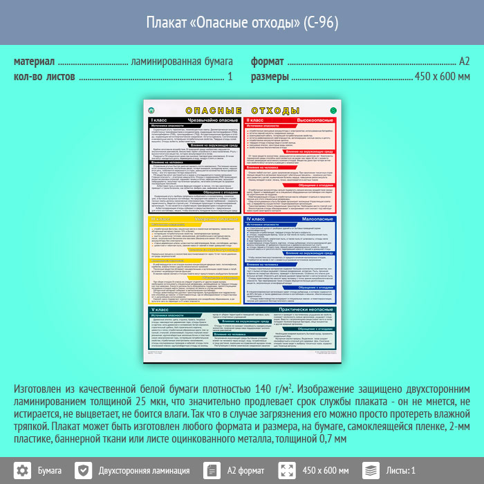 Плакат «Опасные отходы» (С-96, ламинированная бумага, А2, 1 лист) в Москве купить