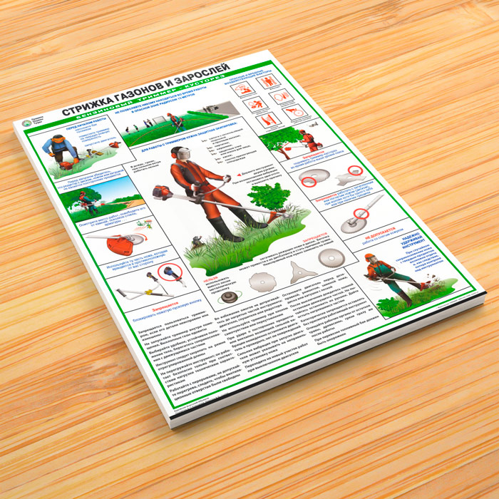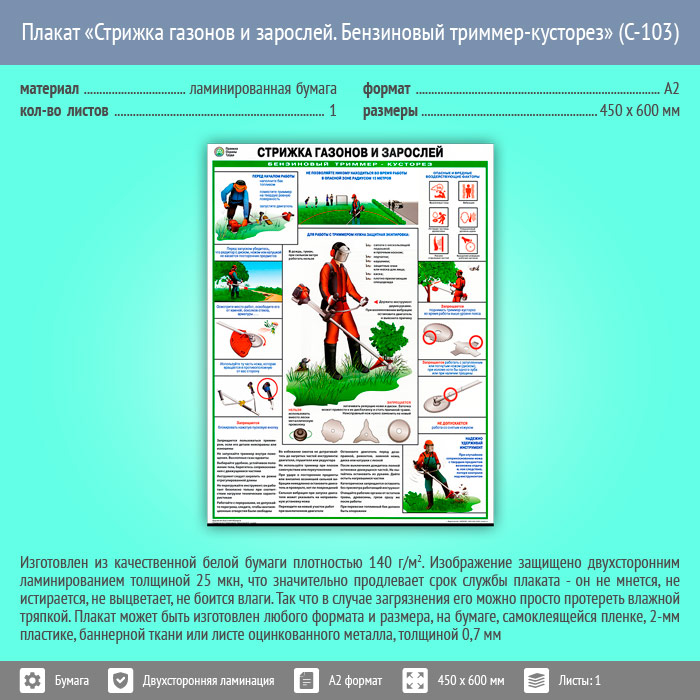 Плакат «Стрижка газонов и зарослей. Бензиновый триммер-кусторез» (С-103, ламинированная бумага, А2, 1 лист) в Москве купить