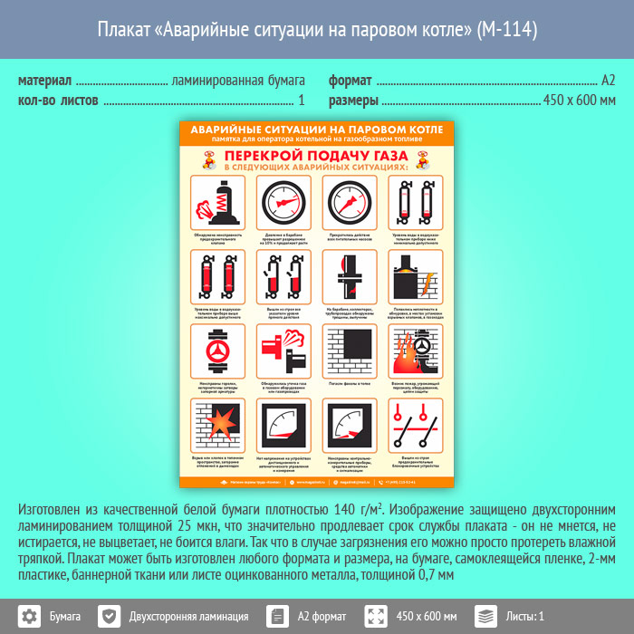 Плакат «Аварийные ситуации на паровом котле» (М-114, ламинированная бумага, А2, 1 лист) в Москве купить