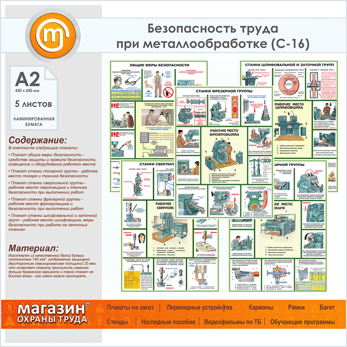 Плакат «Безопасность работ на металлообрабатывающих станках» (С-16, ламинированная бумага, А2, 5 листов) в Москве купить