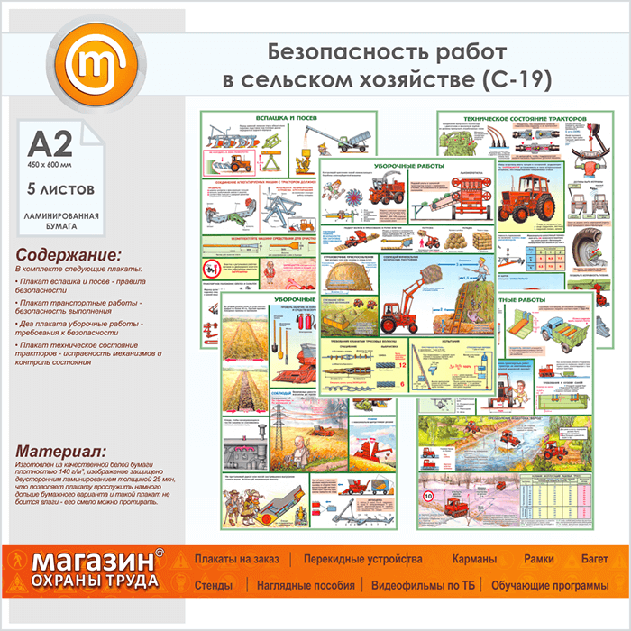 Плакаты «Безопасность работ в сельском хозяйстве» (С-19, ламинированная бумага, А2, 5 листов) в Москве купить