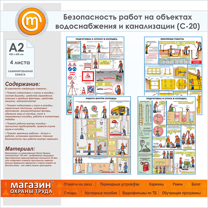 Плакаты «Безопасность работ на объектах водоснабжения и канализации» (С-20, ламинированная бумага, А2, 4 листа) в Москве купить