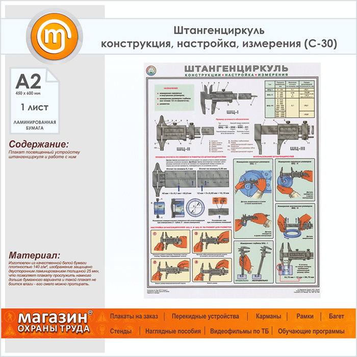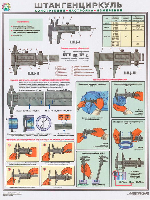 Плакат «Штангенциркуль - конструкция, настройка, измерения» (С-30, ламинированная бумага, А2, 1 лист) в Москве купить