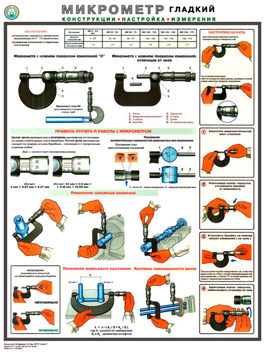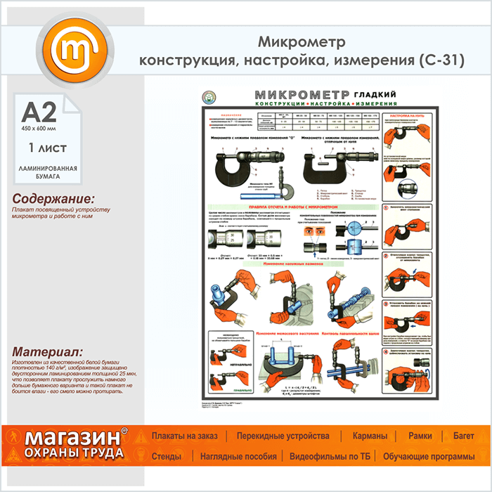 Плакат «Микрометр - конструкция, настройка, измерения» (С-31, ламинированная бумага, А2, 1 лист) в Москве купить