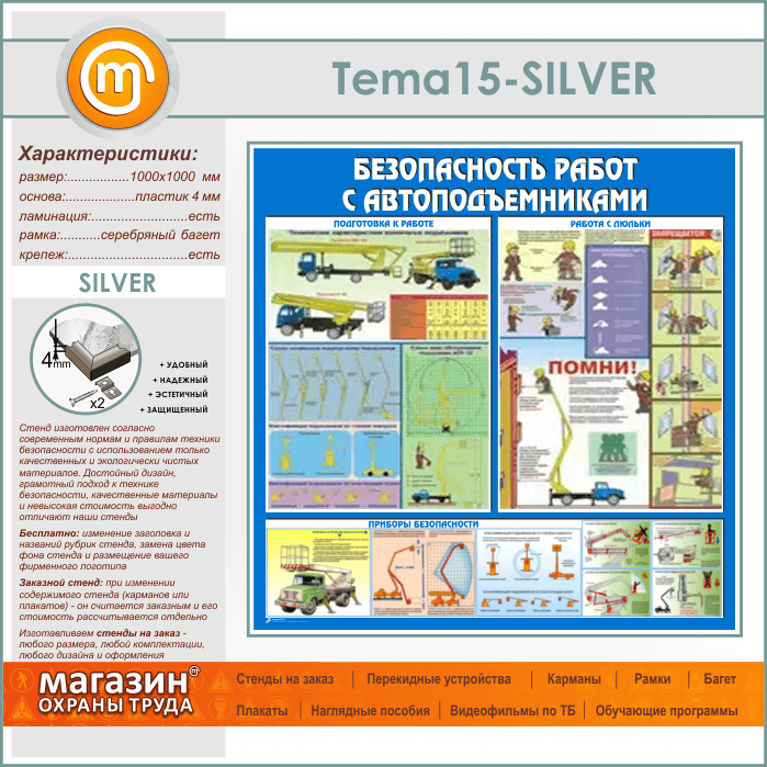 Стенд «Безопасность работ с автоподъемниками» (TM-15-SILVER) в Москве купить