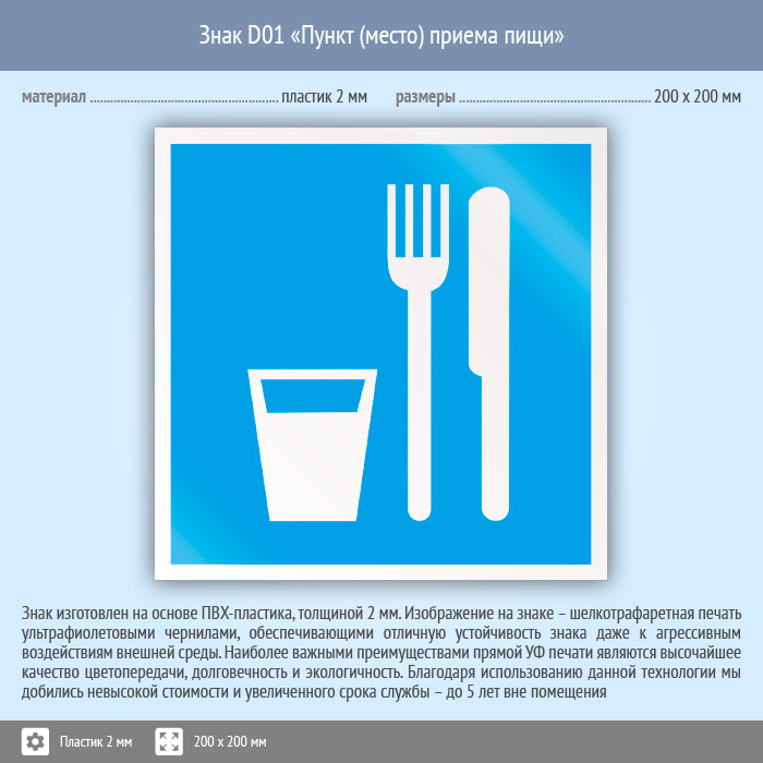 Знак D01 «Пункт (место) приема пищи» (пластик, 200х200 мм) в Москве купить