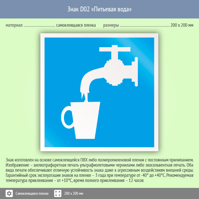 Знак D02 «Питьевая вода» (пленка, 200х200 мм) в Москве купить