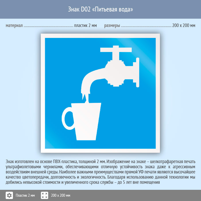 Знак D02 «Питьевая вода» (пластик, 200х200 мм) в Москве купить