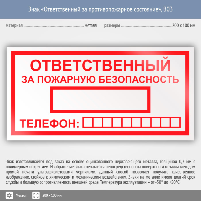 Знак «Ответственный за пожарную безопасность», B03 (металл, 200х100 мм) в Москве купить