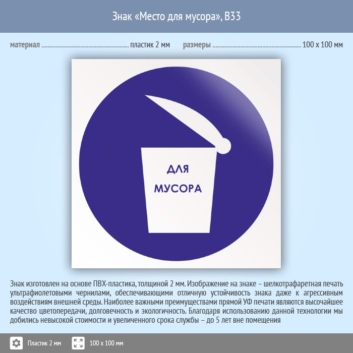 Знак «Место для мусора», B33 (пластик, 100х100 мм) в Москве купить