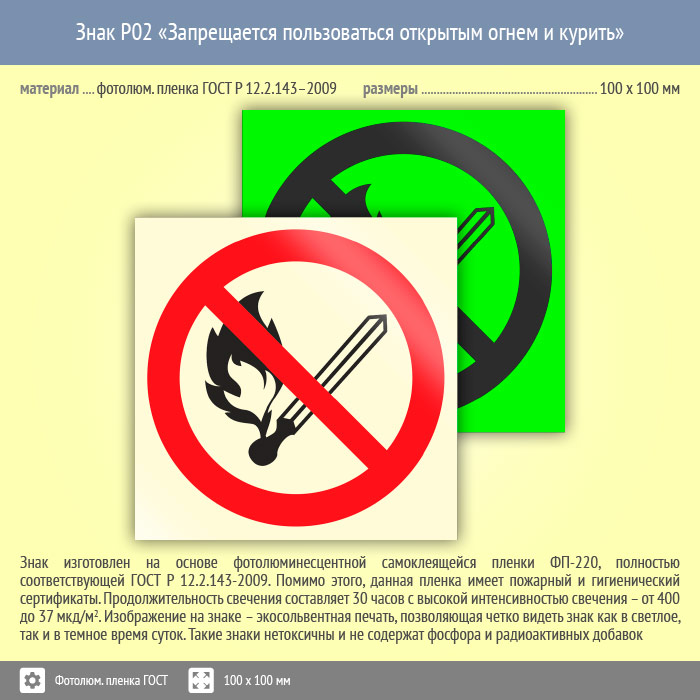 Знак P02 «Запрещается пользоваться открытым огнем и курить» (фотолюминесцентная пленка ГОСТ 34428-2018, 100х100 мм) в Москве купить