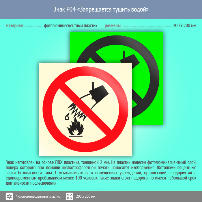 Знак P04 «Запрещается тушить водой» (фотолюминесцентный пластик, 200х200 мм) в Москве купить