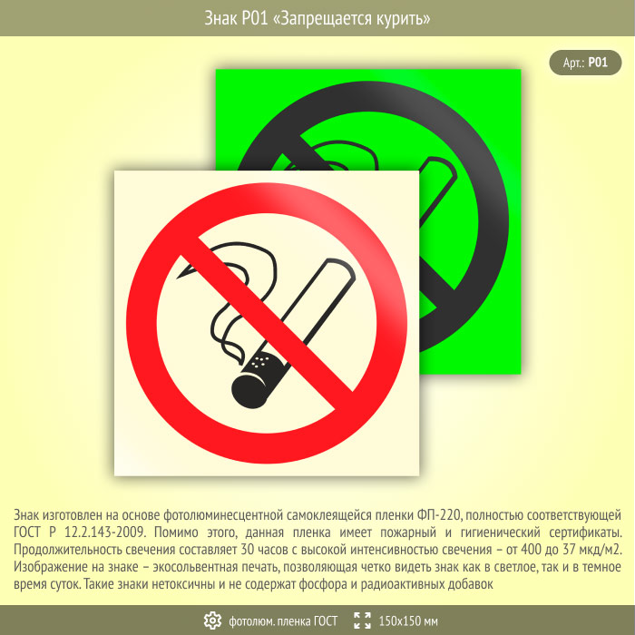 Знак P01 «Запрещается курить» (фотолюминесцентная пленка ГОСТ 34428-2018, 150х150 мм) в Москве купить
