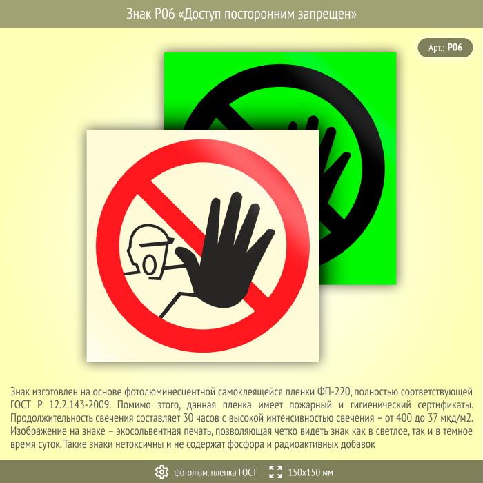 Знак P06 «Доступ посторонним запрещен» (фотолюминесцентная пленка ГОСТ 34428-2018, 150х150 мм) в Москве купить