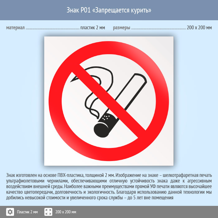 Знак P01 «Запрещается курить» (пластик, 200х200 мм) в Москве купить