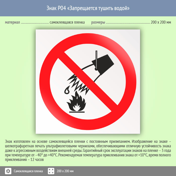Знак P04 «Запрещается тушить водой» (пленка, 200х200 мм) в Москве купить
