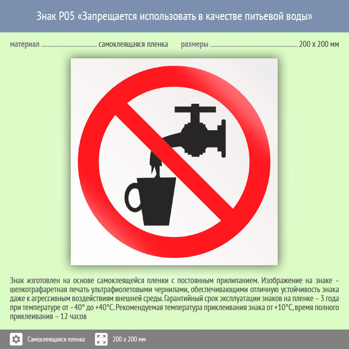 Знак P05 «Запрещается использовать в качестве питьевой воды» (пленка, 200х200 мм) в Москве купить