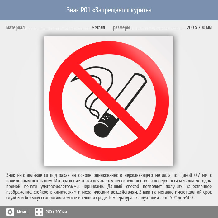Знак P01 «Запрещается курить» (металл, 200х200 мм) в Москве купить