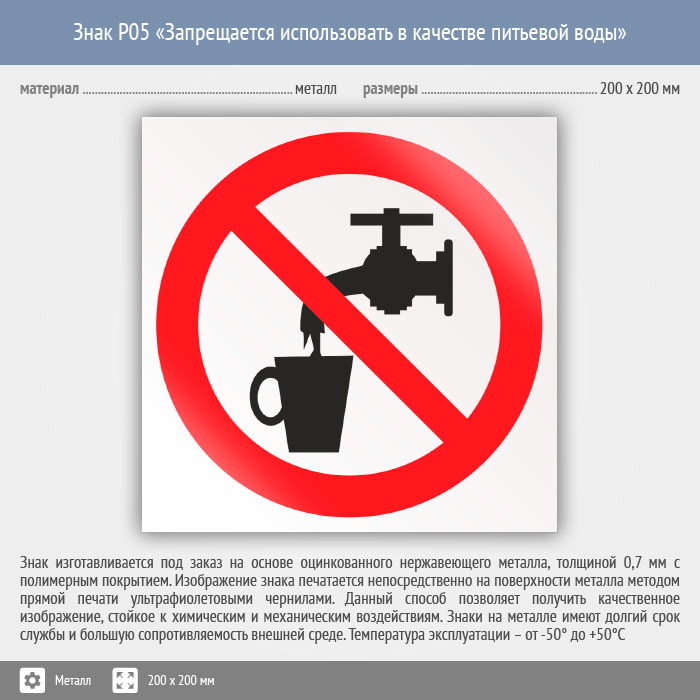 Знак P05 «Запрещается использовать в качестве питьевой воды» (металл, 200х200 мм) в Москве купить