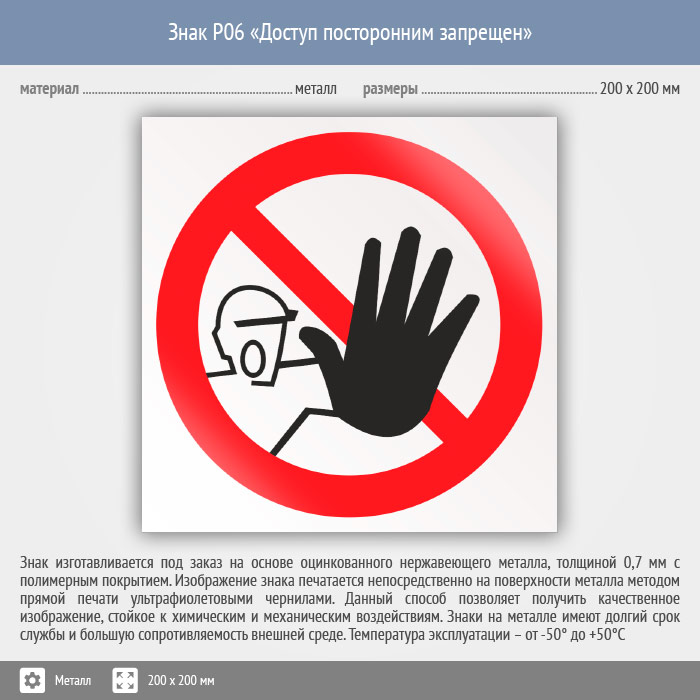 Знак P06 «Доступ посторонним запрещен» (металл, 200х200 мм) в Москве купить