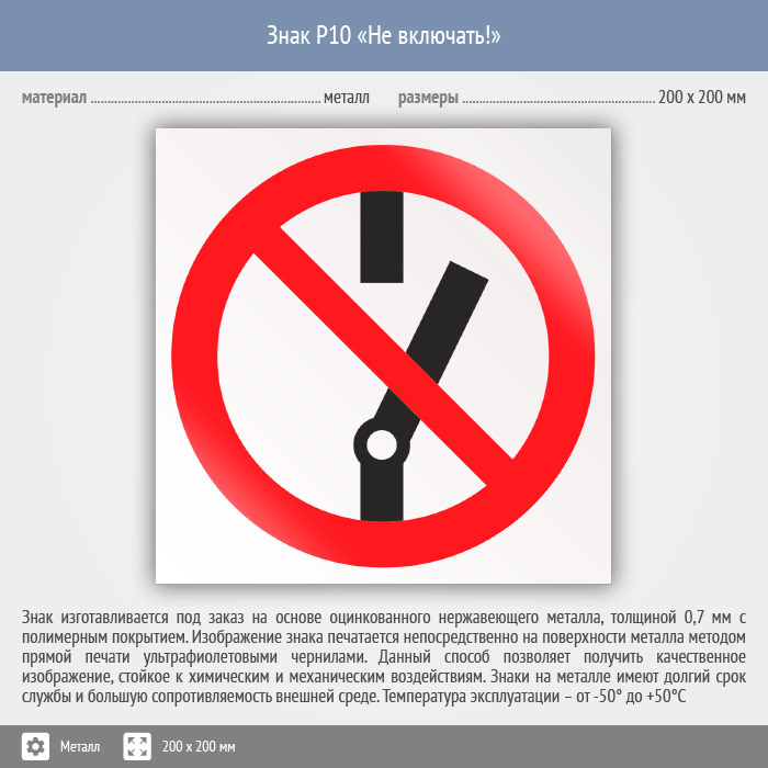 Знак P10 «Не включать!» (металл, 200х200 мм) в Москве купить