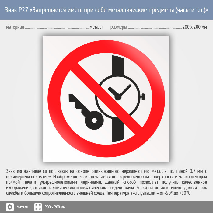 Знак P27 «Запрещается иметь при (на) себе металлические предметы (часы и т.п.)» (металл, 200х200 мм) в Москве купить