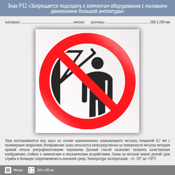 Знак P32 «Запрещается подходить к элементам оборудования с маховыми движениями большой амплитуды» (металл, 200х200 мм) в Москве купить