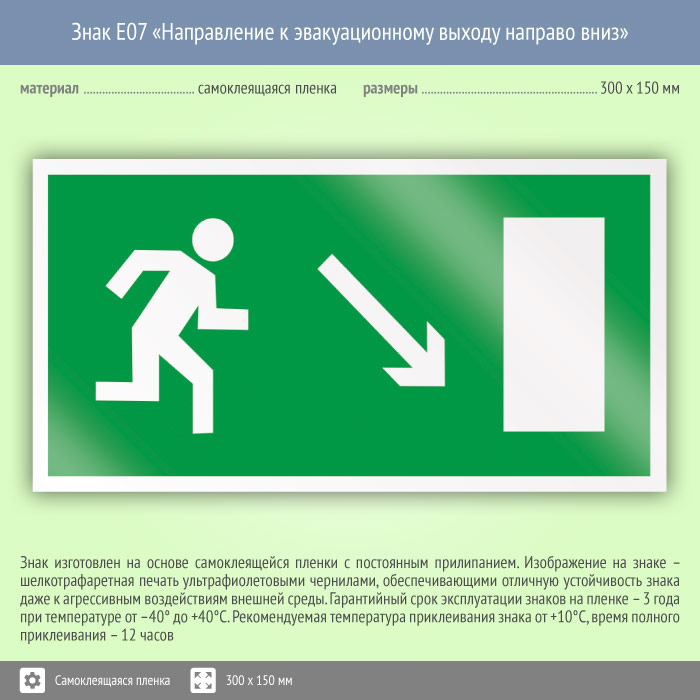 Знак E07 «Направление к эвакуационному выходу направо вниз» (фотолюм. пленка, 300х150 мм)