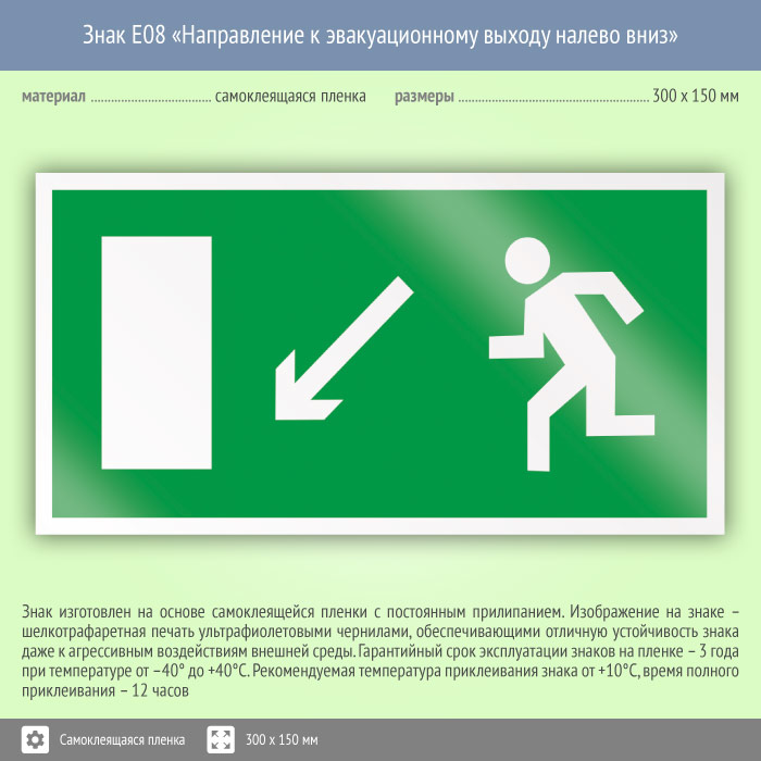 Знак E08 «Направление к эвакуационному выходу налево вниз» (фотолюм. пленка, 300х150 мм)