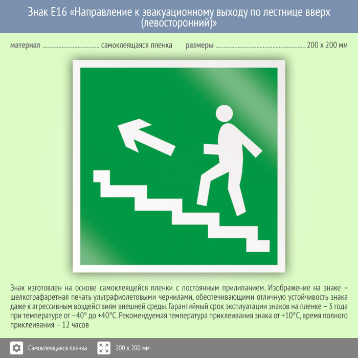 Знак E16 «Направление к эвакуационному выходу по лестнице вверх (левосторонний)» (фотолюм. пленка, 200х200 мм)