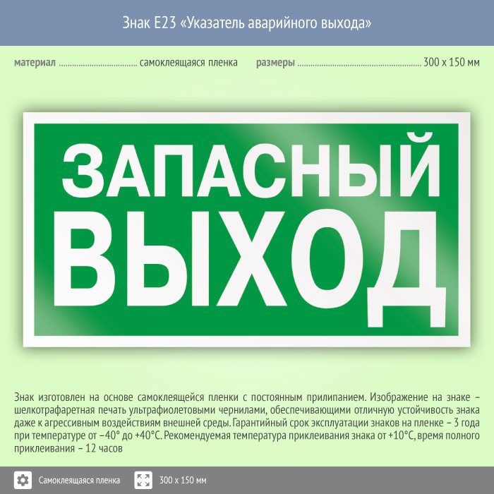 Знак «Указатель запасного выхода» обозначает, что этот выход является запасным и используется только во время эвакуации. Код знака: E23