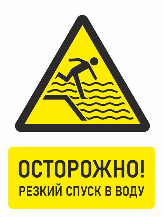 Знак «Осторожно! Резкий спуск в воду», БВ-32 как уже видно из названия, предостерегает об опасности в связи с резким спуском в воду, что важно как для детей, так и для взрослых, не умеющих плавать