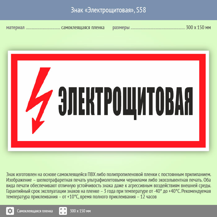 Знак «Электрощитовая» может быть изготовлен любого размера на самоклеящейся пленке, пластике толщиной 0.5, 2 или 4 мм и металле. Также возможно применение фотолюминесцентных и световозвращающих материалов