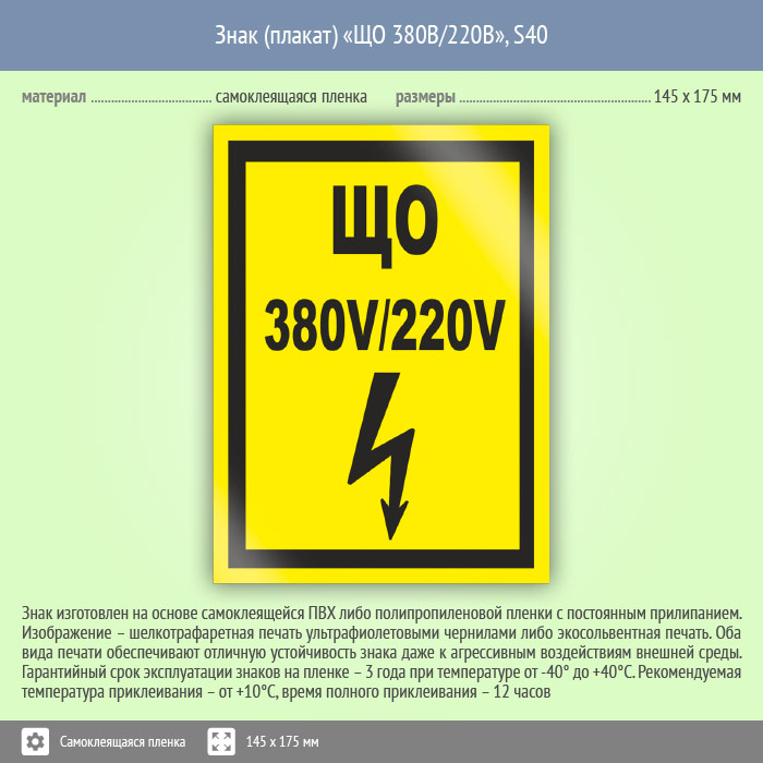Знак «ЩО 380В|220В» может быть изготовлен любого размера на самоклеящейся пленке, пластике толщиной 0.5, 2 или 4 мм и металле. Также возможно применение фотолюминесцентных и световозвращающих материалов