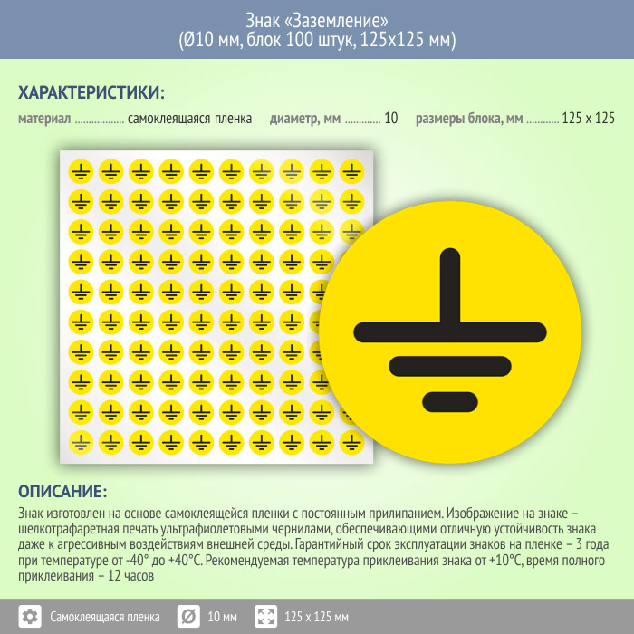 Знак «Заземление» может быть изготовлен любого размера на самоклеящейся пленке, пластике толщиной 0.5, 2 или 4 мм и металле. Также возможно применение фотолюминесцентных и световозвращающих материалов