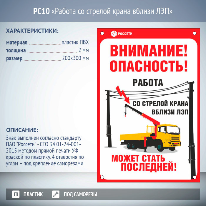 Знаки безопасности «Работа со стрелой крана вблизи ЛЭП» выполнены согласно стандарта ПАО «Россети» – СТО 34.01-24-001-2015 методом прямой печати УФ краской по ПВХ-пластику (толщиной 2 мм) либо оцинкованному металлу (толщиной 0,8 мм с полимерным покрытием). Размеры знаков – 200×300 мм. Для крепления знаков предусмотрены 4 отверстия по углам – под крепление саморезами на деревянную опору и в моделях с отверстиями под бандажную ленту – 8 отверстий для крепления на бетонную и металлическую опоры. Также есть версии без отверстий