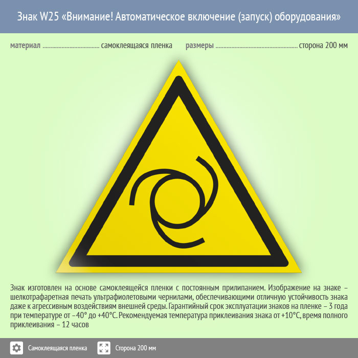 Знак W25 «Внимание! автоматическое включение (запуск) оборудования» (пленка, сторона 200 мм)