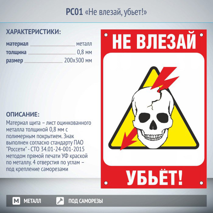 Знак «Не влезай, убьет!», РС01 (металл, 200х300 мм, отверстия под саморезы) в Москве купить