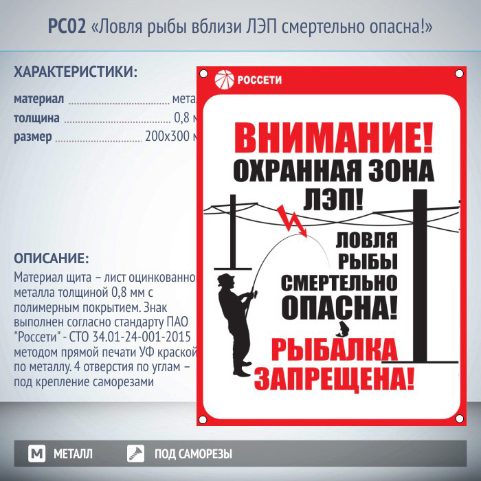 Знак «Ловля рыбы вблизи ЛЭП смертельно опасна!», РС02 (металл, 200х300 мм, отверстия под саморезы) в Москве купить
