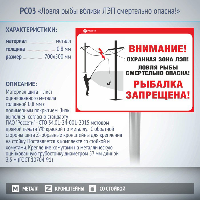 Информационный щит «Ловля рыбы вблизи ЛЭП смертельно опасна!», РС03 (металл, 700х500 мм, с металлической стойкой) в Москве купить