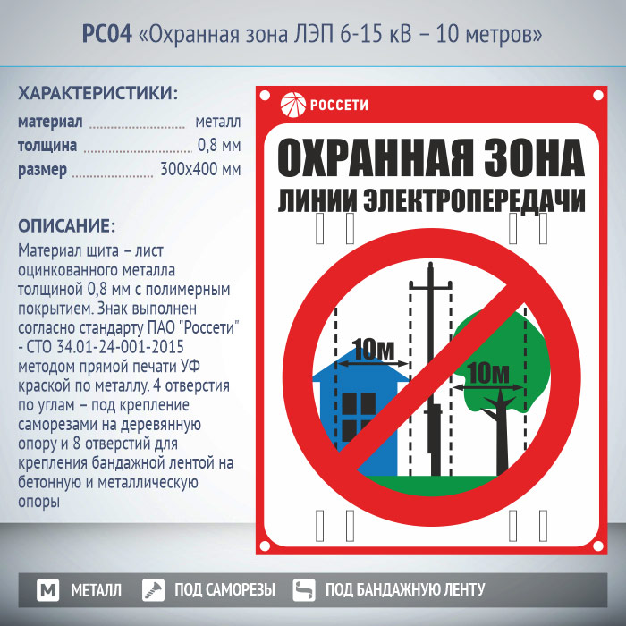 Знак «Охранная зона ЛЭП 6-15 кВ – 10 метров», РС04 (металл, 300х400 мм, отверстия под бандажную ленту) в Москве купить