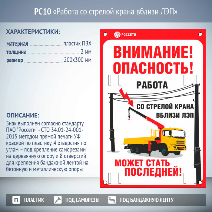 Знак «Работа со стрелой крана вблизи ЛЭП», РС10 (пластик 2 мм, 200х300 мм, отверстия под бандажную ленту) в Москве купить