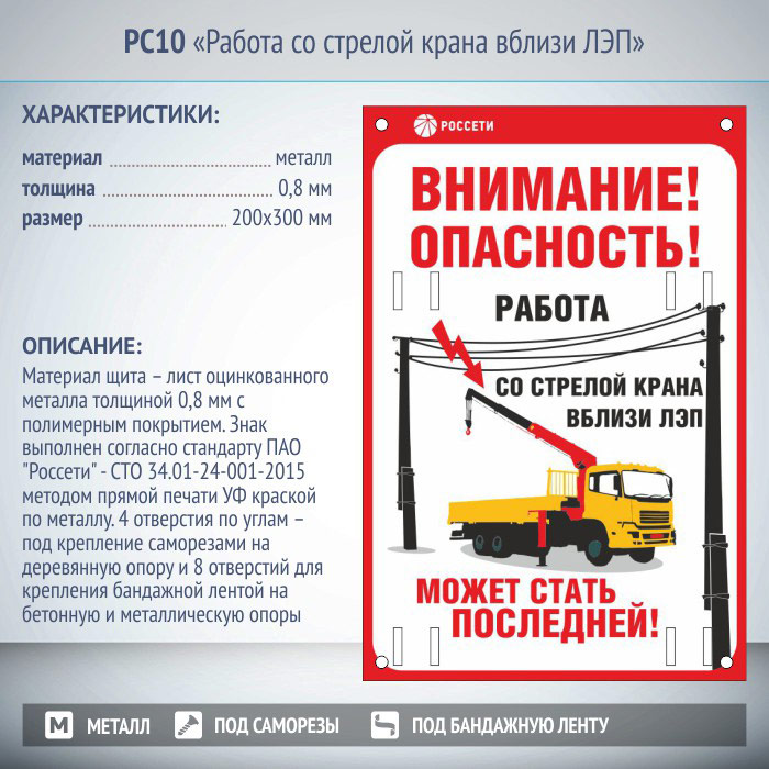 Знак «Работа со стрелой крана вблизи ЛЭП», РС10 (металл, 200х300 мм, отверстия под бандажную ленту) в Москве купить