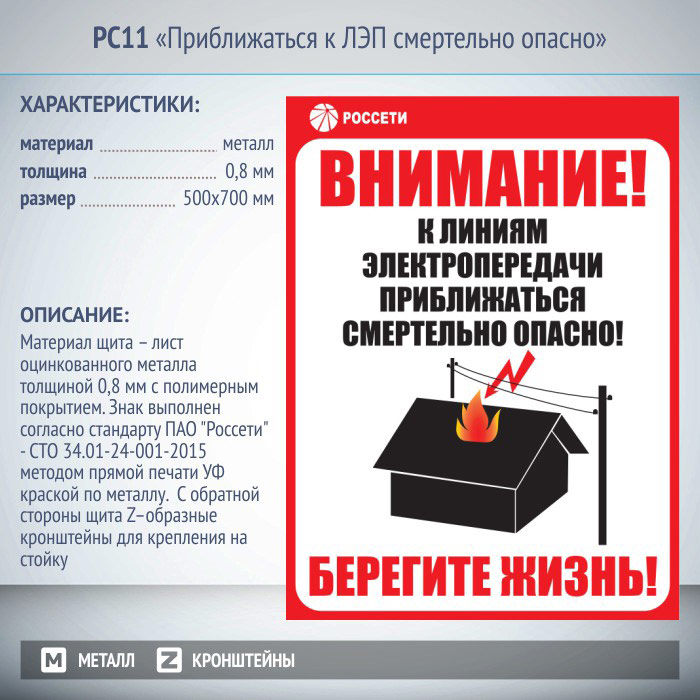 Информационный щит «Приближаться к ЛЭП смертельно опасно», РС11 (металл, 500х700 мм, кронштейны для крепления) в Москве купить