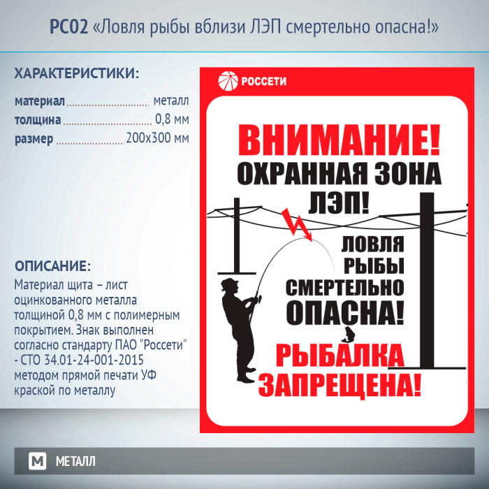Знак «Ловля рыбы вблизи ЛЭП смертельно опасна!», РС02 (металл, 200х300 мм) в Москве купить
